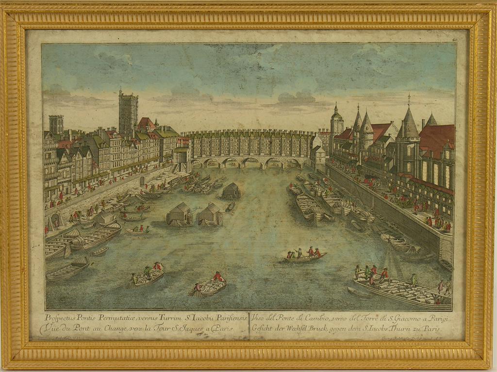 A French pin-prick coloured engraving, 'Vue de Magazin de Munition de la Ville de Delft', 12.25 x 16.25in (31 x 41cm), and another 'Pont au Change a Paris.' (2)