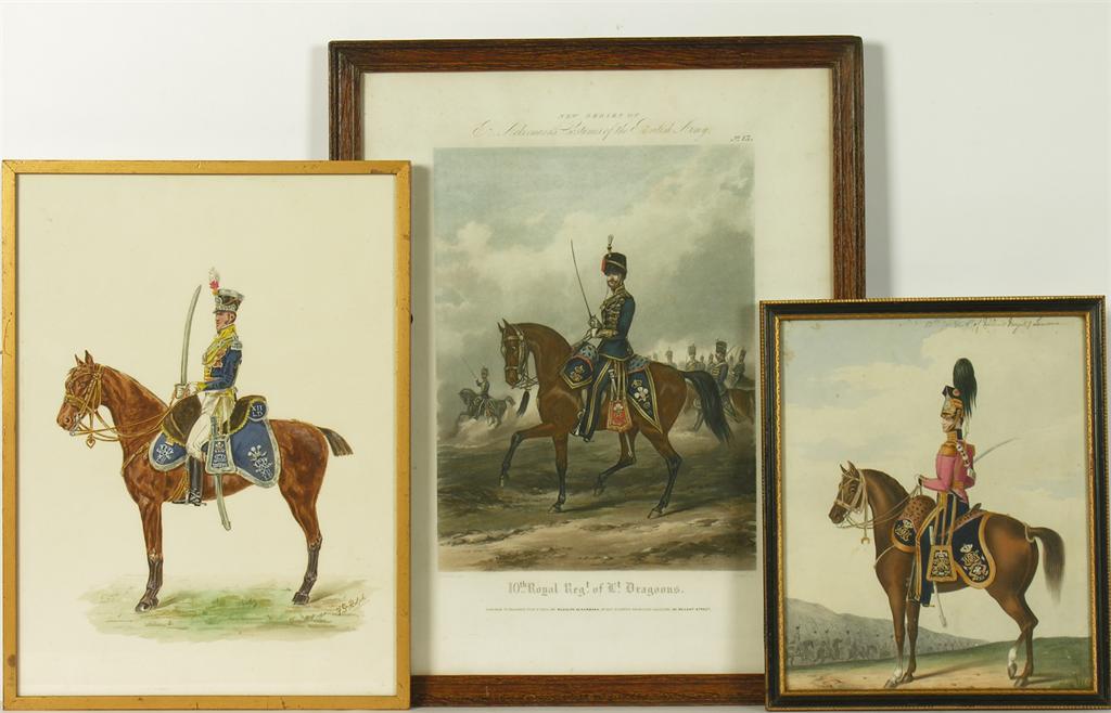 After R. Martens. '10th Royal Regt of Lt Dragoons,' a coloured aquatint, 15.35 x 11in (39.4 x 28cm), a lithograph, 'Prince of Wales, Royal Lancers,' and a watercolour by F.G. Rolph, 'XII, Light Dragoon' mounted officer. (3)