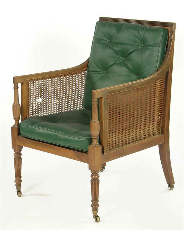 A Regency style mahogany bergere, with buttoned squab cushions, on brass castors.