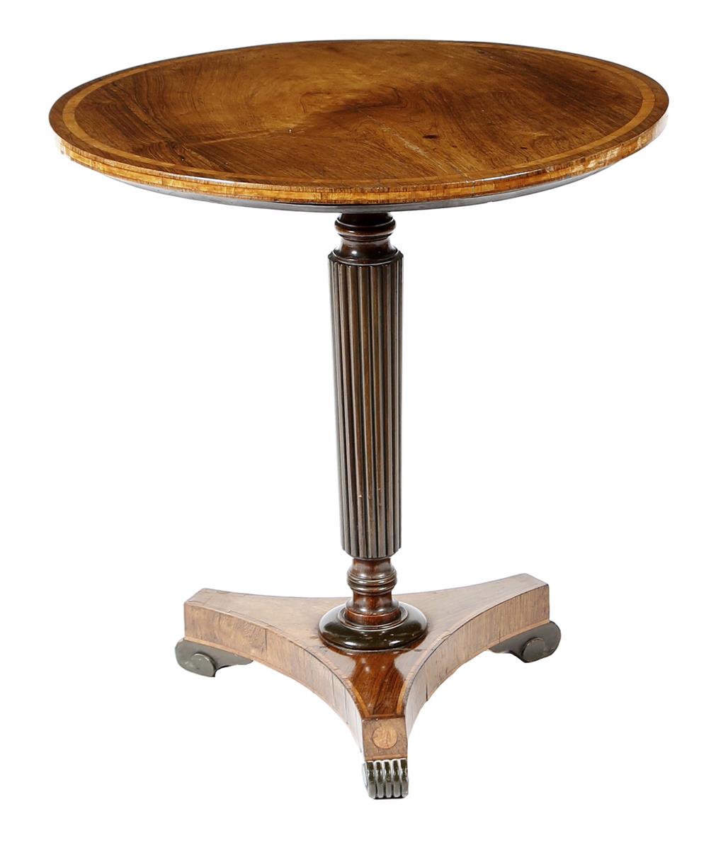 A 19th century rosewood occasional table, with satinwood banding, the circular top on a green stained ribbed stem on a triform base and conforming scroll feet, 69.6cm high, 66cm diameter.