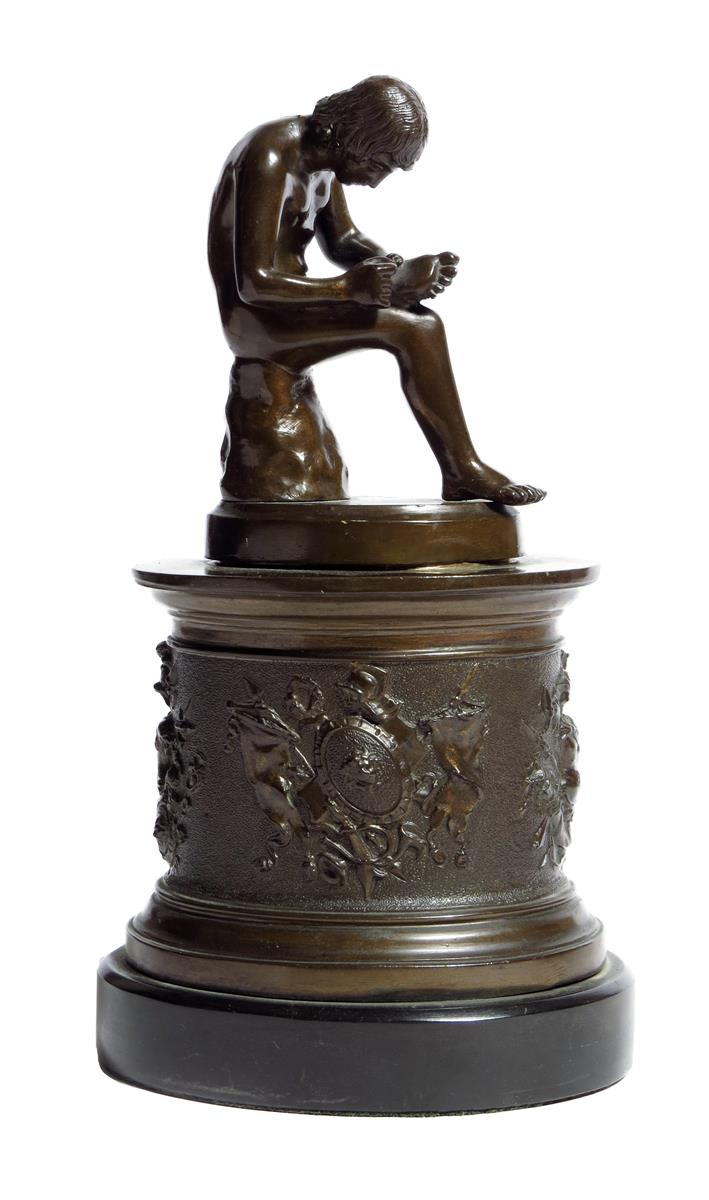 After the antique. A Grand Tour bronze inkwell, the lift-off top in the form of Spinario revealing a glass inkwell, the oval plinth base cast with trophies of war, on a marble base, late 19th century, 20.8cm high.