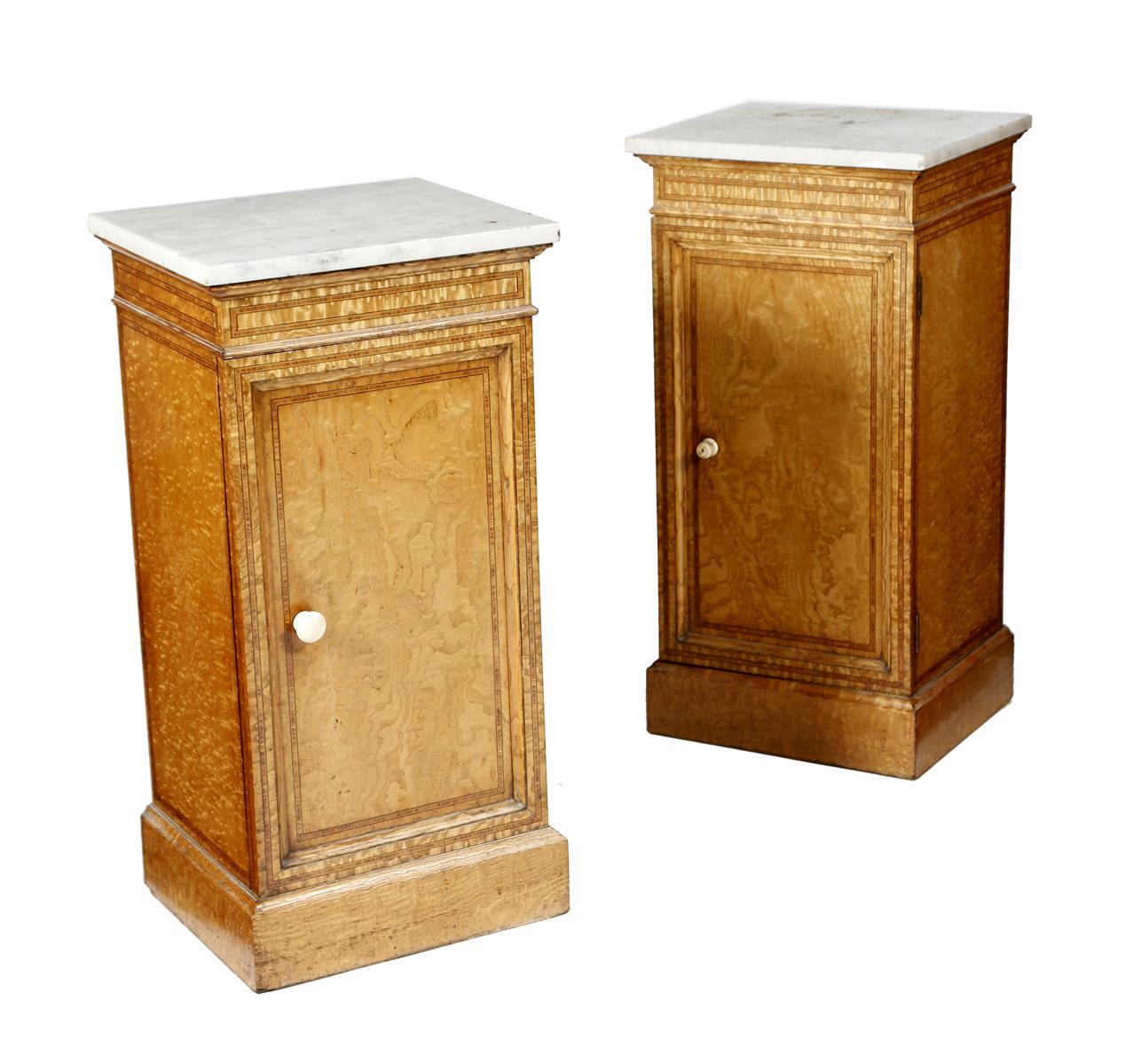 λ A pair of Victorian ash bedside cupboards, with rosewood banding, each with a white marble top above a panelled door with an ivory knob handle enclosing a shelf, 75.7cm high, 38cm wide, 33cm deep. (2)