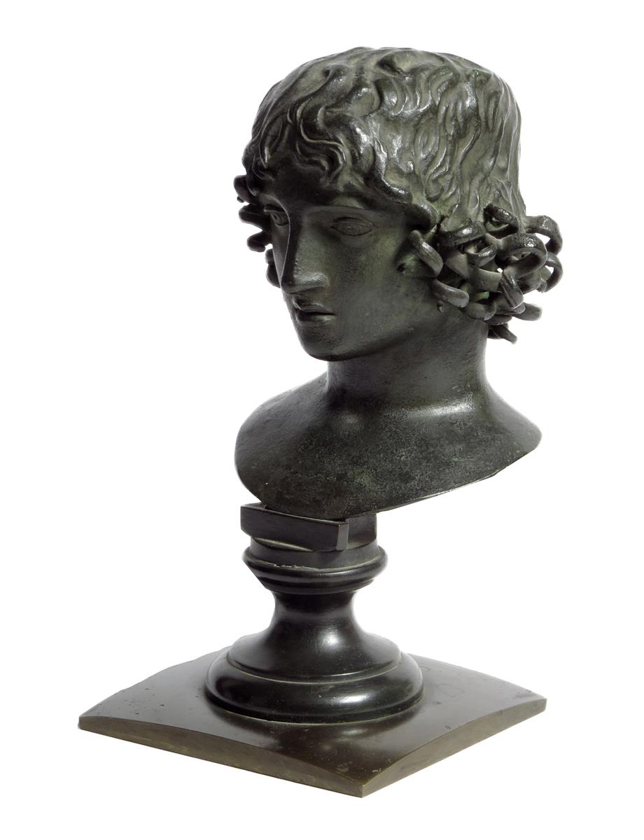 After the antique. A bronze bust of a Roman youth, with curly hair, on a turned socle, 19th century, 24.5cm high.