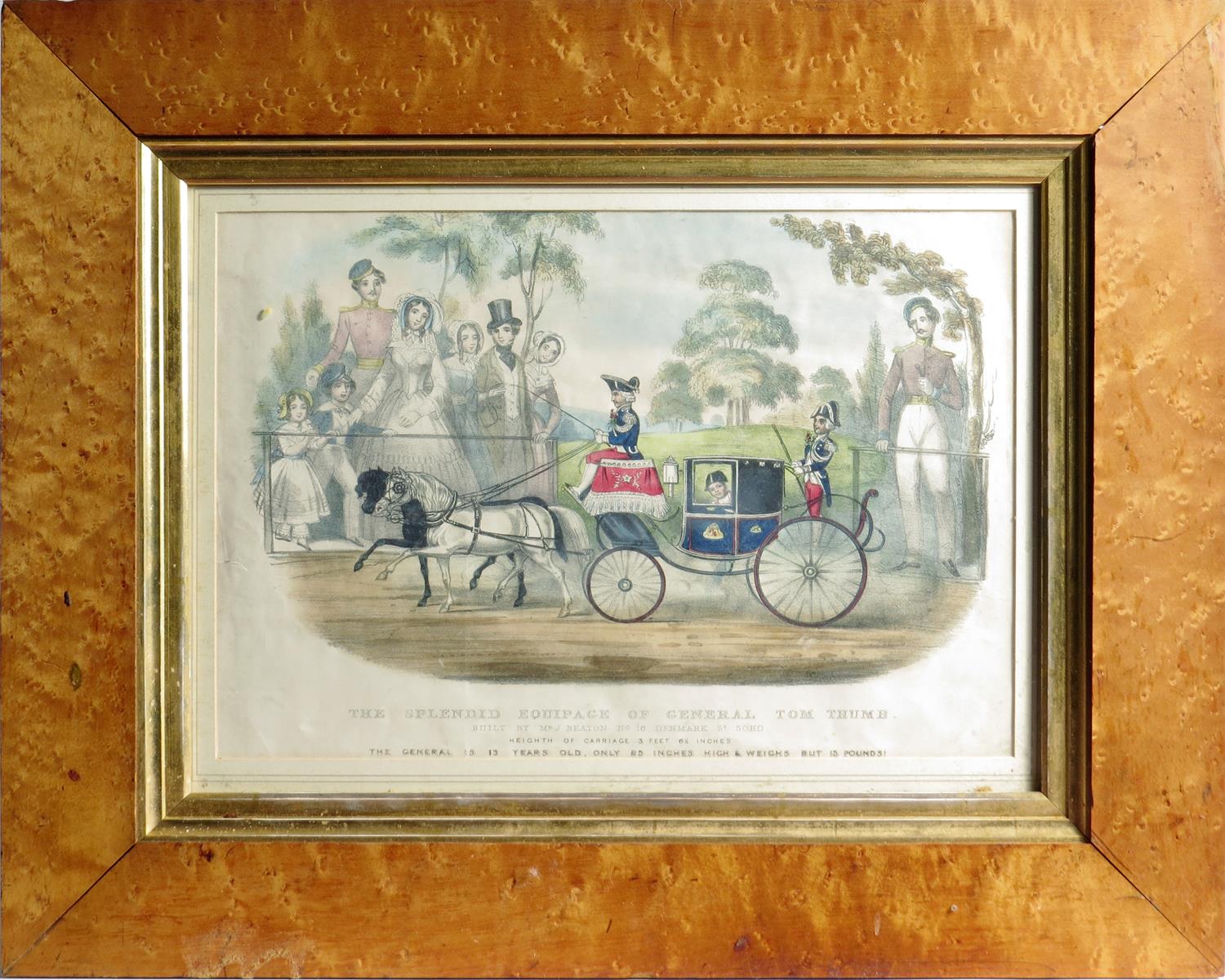 A Victorian coloured lithograph of Tom Thumb, titled 'THE SPLENDID EQUIPAGE OF GENERAL TOM THUMB, BUILT BY MR J BEATON No. 16 DENMARK ST. SOHO, HEIGHTH OF CARRIAGE 3 FEET 6 1/12 INCHES, THE GENERAL IS 13 YEARS OLD, ONLY 25 INCHES HIGH & WEIGHS BUT 15 POUNDS