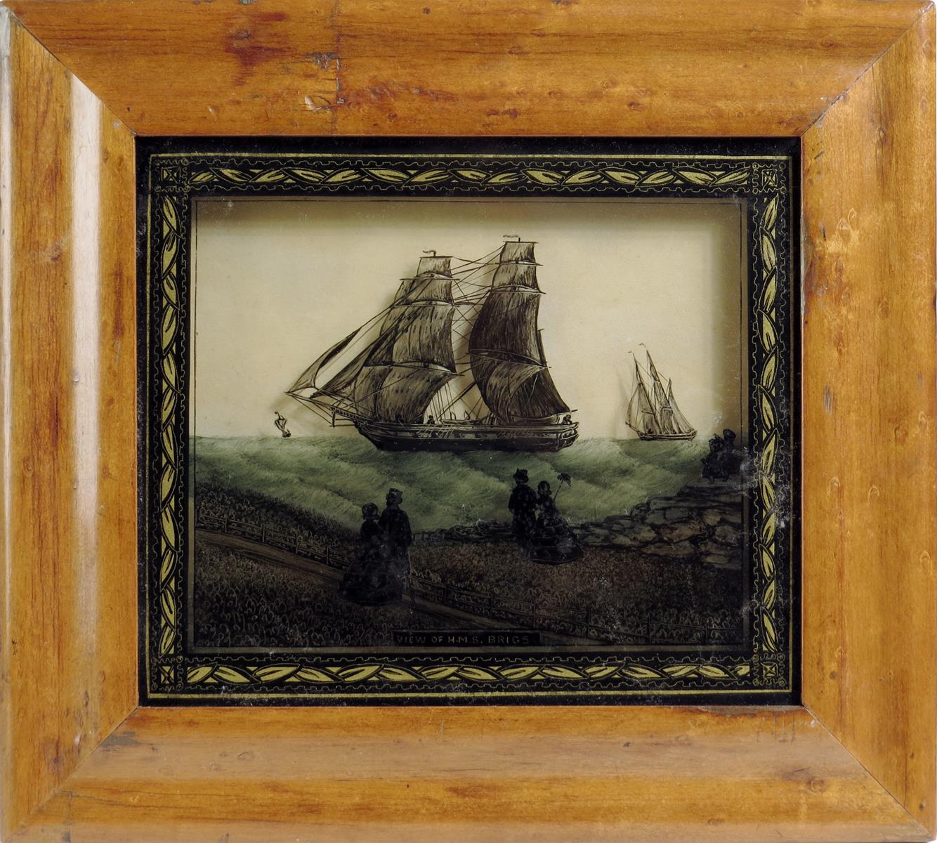 A pair of early 19th century reverse glass silhouette marine pictures, depicting 'H.M.S. EURYALUS' and 'VIEW OF H.M.S. BRIGS', with figures walking along cliff paths in the foreground, each with a verre églomisé mount and in a bird's eye maple frame, 27.5 x 30.1cm. (2)