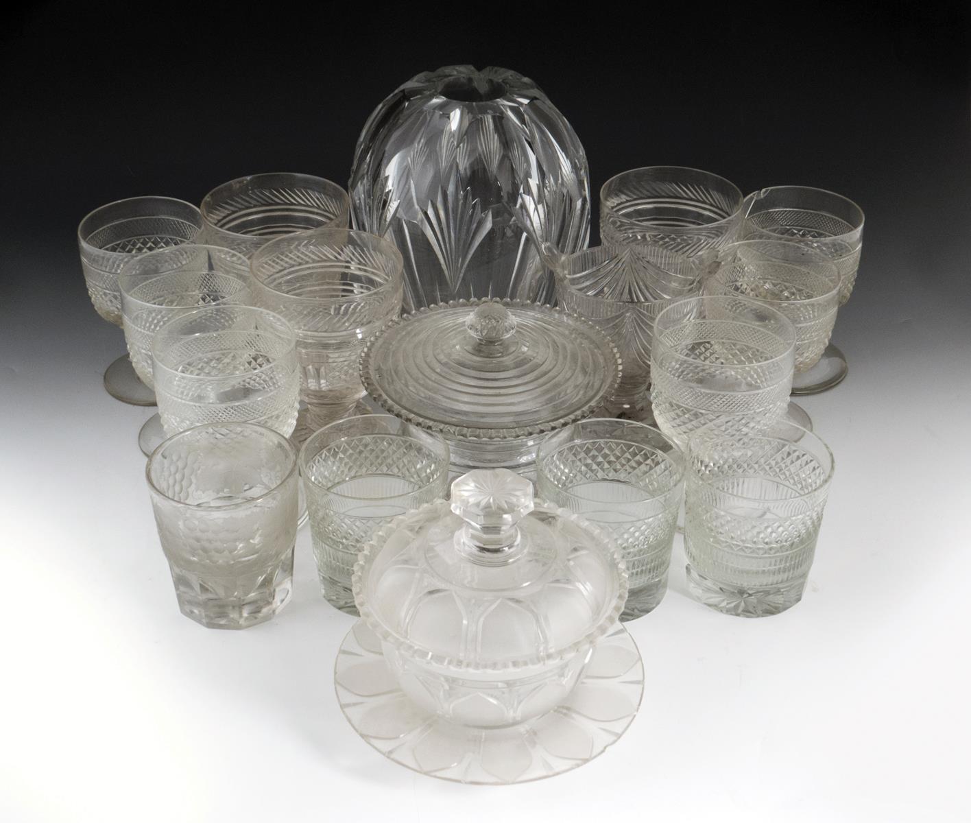 A collection of cut glassware, including: rummers, tumblers, a sweetmeat jar and cover and a vase, 19th century and later, 22cm high (max). (19)