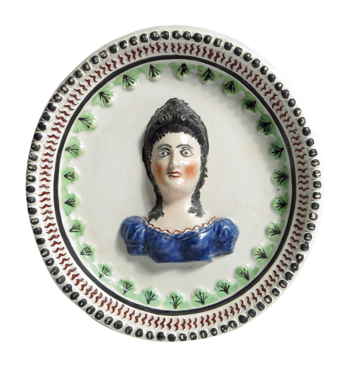 A George III Staffordshire pearlware pottery rondel, decorated with a portrait bust of Queen Charlotte, with a moulded frame, 18.5 x 17.5cm.