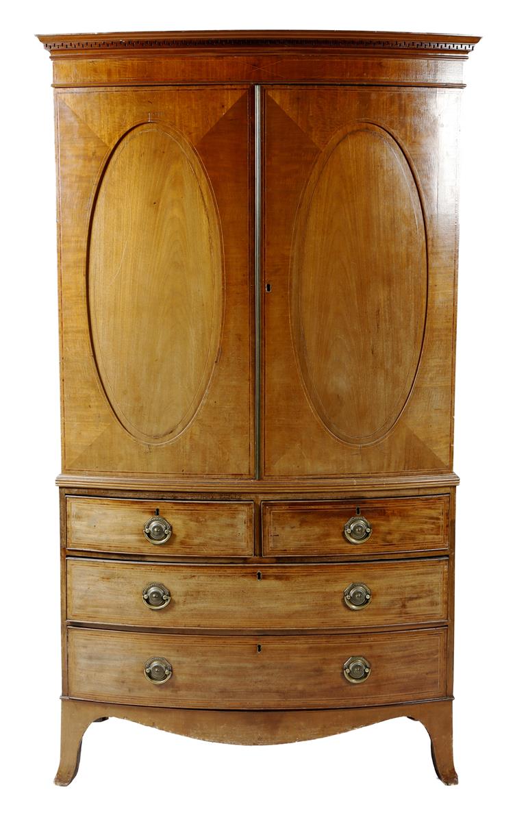 A Victorian mahogany bowfront linen press, inlaid with stringing and banding with a pair of oval panelled doors enclosing a hanging rail above two short and two long drawers, 194cm high, 108cm wide, 52cm deep.