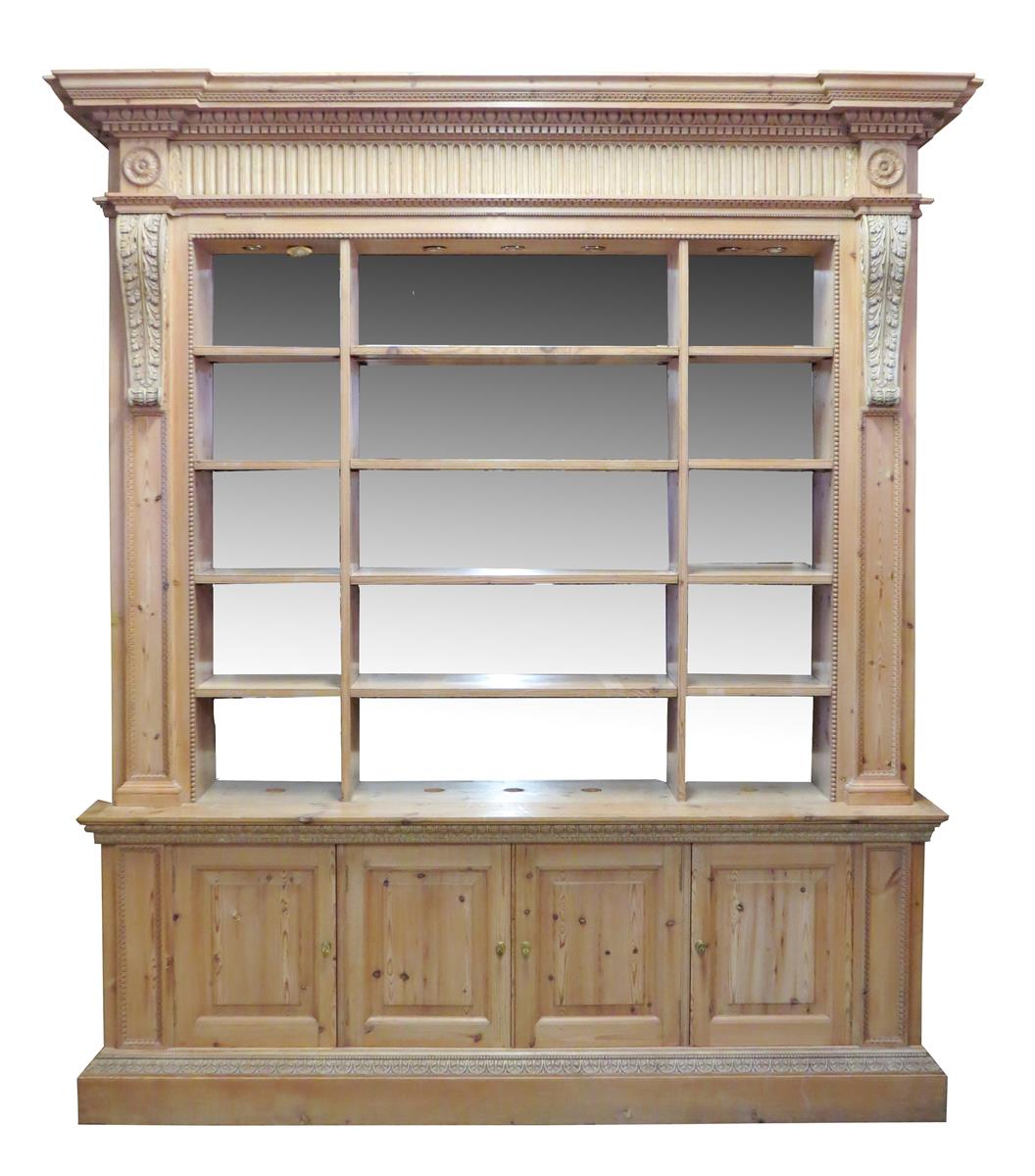 A large pine bookcase, with a detachable breakfront cornice with an egg and dart and dentil moulding above a fluted frieze and flanked by flowerhead paterae, with acanthus carved corbels, with a mirrored back and twelve adjustable shelves, the base with three cupboards, each with a shelf, 18th century elements and later, 274.6cm high, 247.4cm wide, 52cm deep.