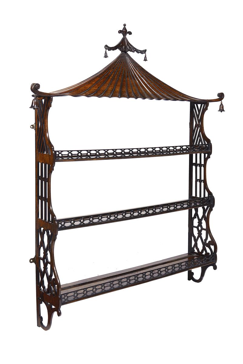 λ A set of George III 'Chinese Chippendale' rosewood hanging wall shelves, with a carved pagoda top hung with bells above three graduated tiers with fretwork galleries and with pierced fretwork ends, 129.8cm high, 109.4cm wide. 19.1cm deep.