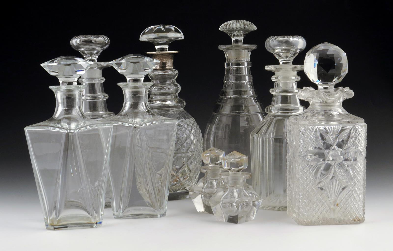 Seven glass decanters, including: a pair of spirit decanters, each with a stopper, one with a silver mount together with a pair of inkwells, early 19th century and later, 28.7cm high (max).
