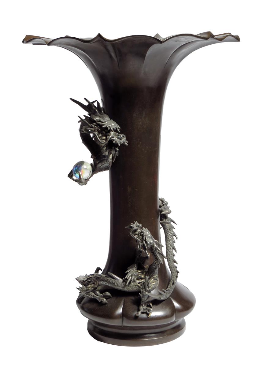 A Japanese bronze dragon vase, the body applied with two silvered scaly beasts with gilt highlights chasing a glass pearl, the base with a three character mark, Meiji 1868-1912, 54.3cm high.