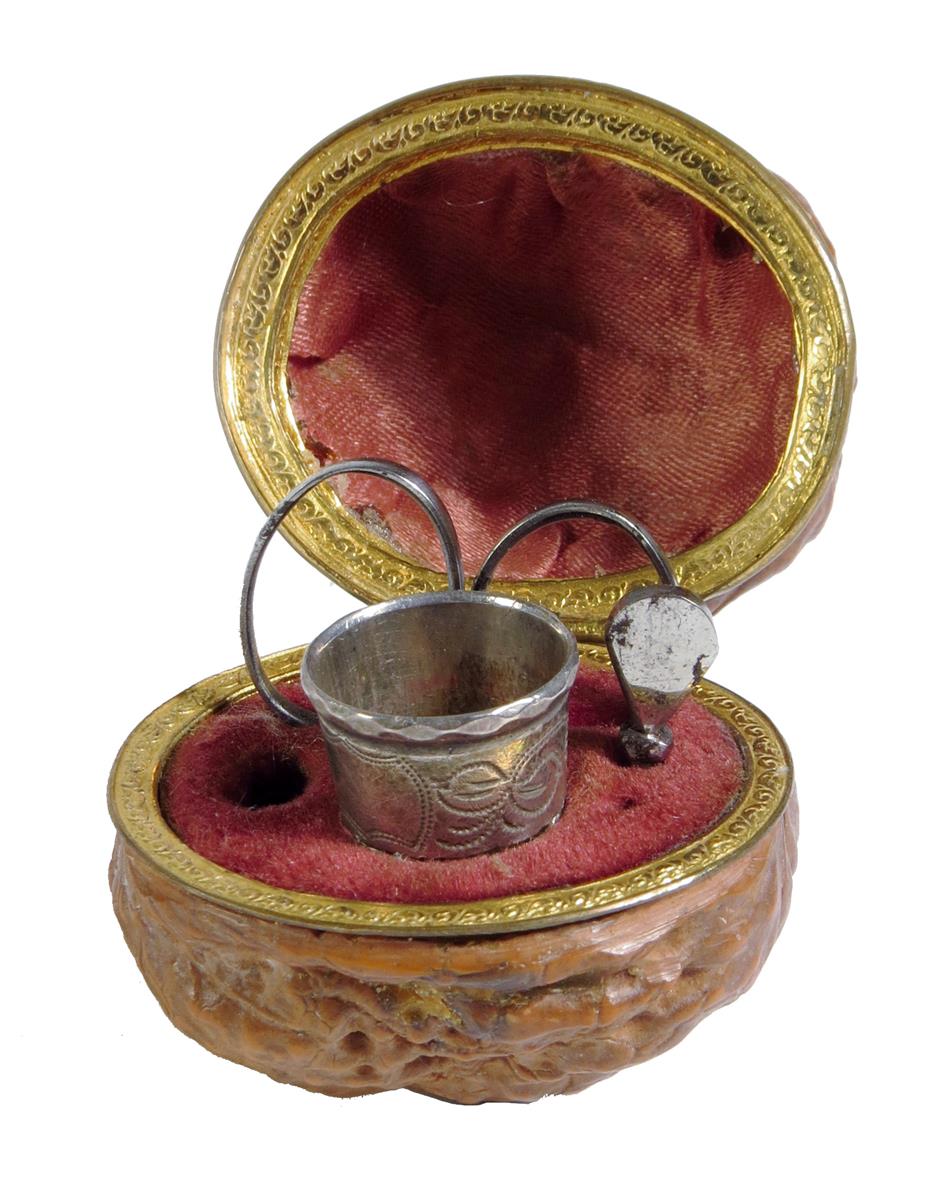 A 19th century French walnut and gilt metal mounted étui, hinged to reveal a fitted interior with a pair of steel scissors, a pierced thimble and a stiletto, 4cm wide.