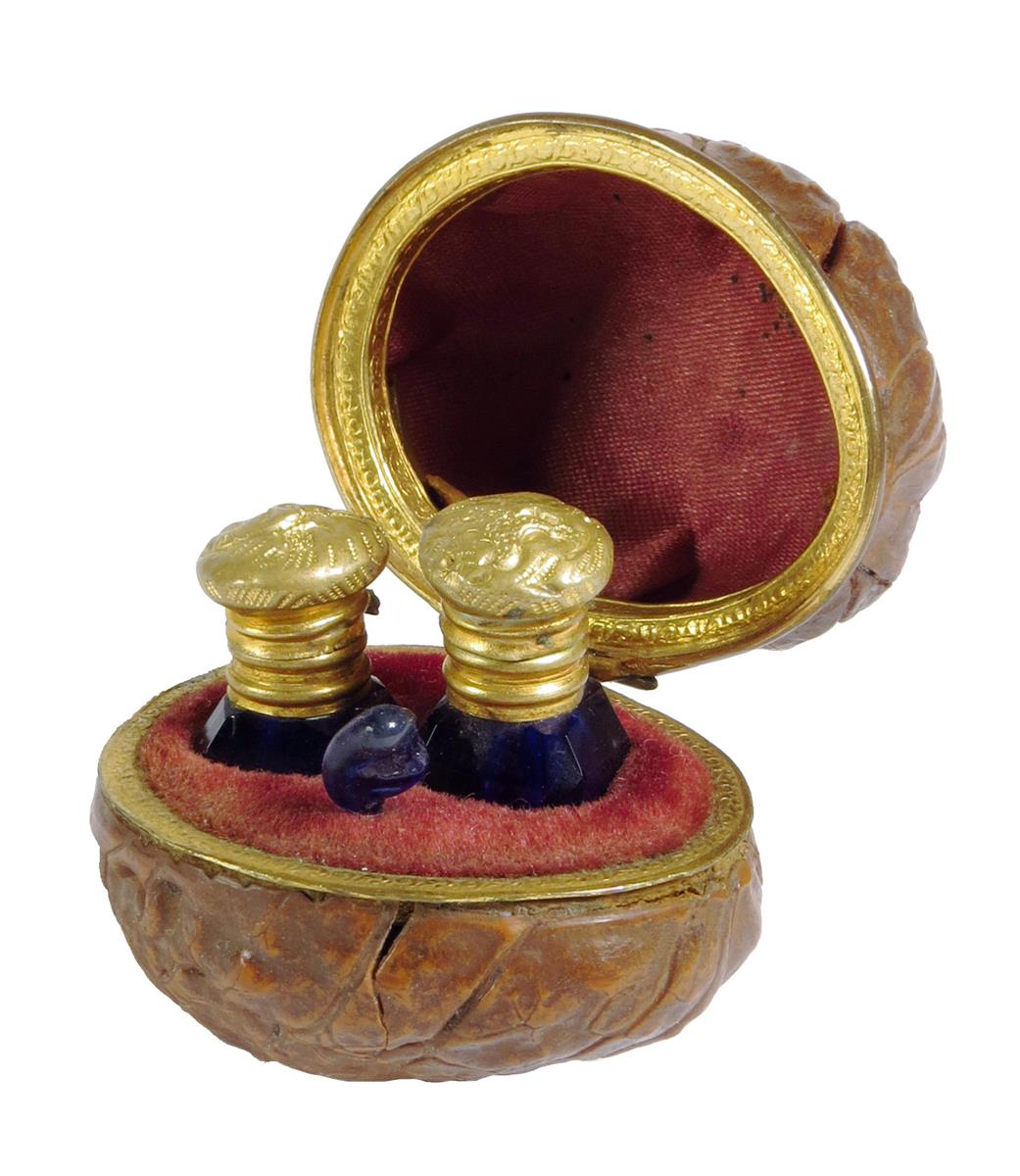 A 19th century French walnut and gilt metal mounted étui, the interior fitted with a pair of glass scent bottles with gilt metal hinged tops together with a blue glass spoon, 4.3cm wide.