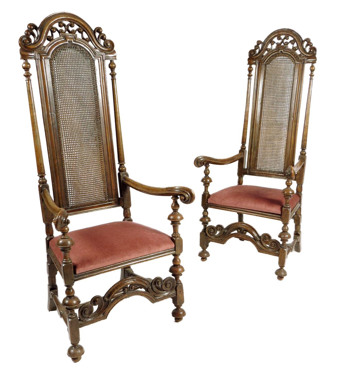 A set of six Queen Anne walnut and beechwood highback chairs, each with a scroll and leaf carved crest above a caned back and seat, with later squab cushions, the mushroom turned and block legs with a conforming arched front stretcher, comprising; a pair of open armchairs and four side chairs. (6)