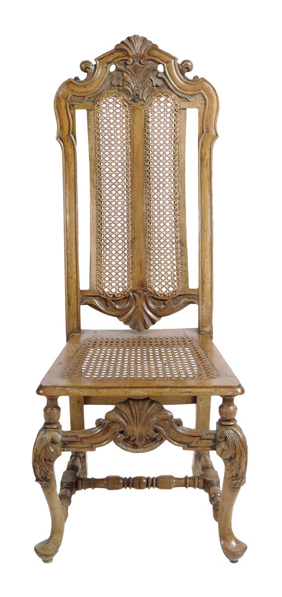 A Queen Anne walnut highback side chair, the scroll carved toprail centered a shell above a cane back and seat on acanthus carved cabriole front legs united by a carved stretcher.