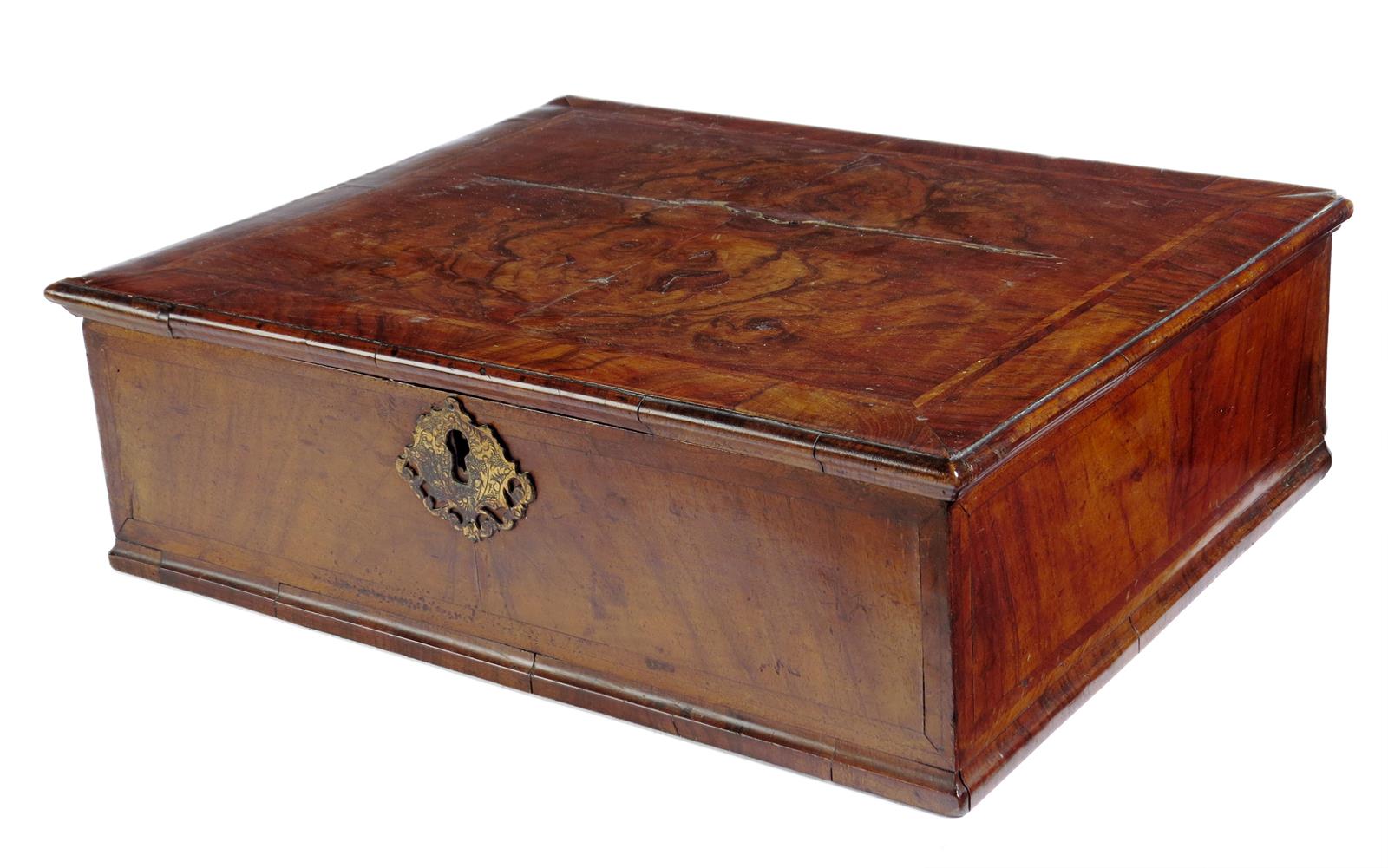 An early 18th century walnut lace box, cross and feather banded, the quarter veneered hinged top revealing a vacant interior, with an engraved brass escutcheon, 14cm high, 45cm wide, 36.5cm deep.