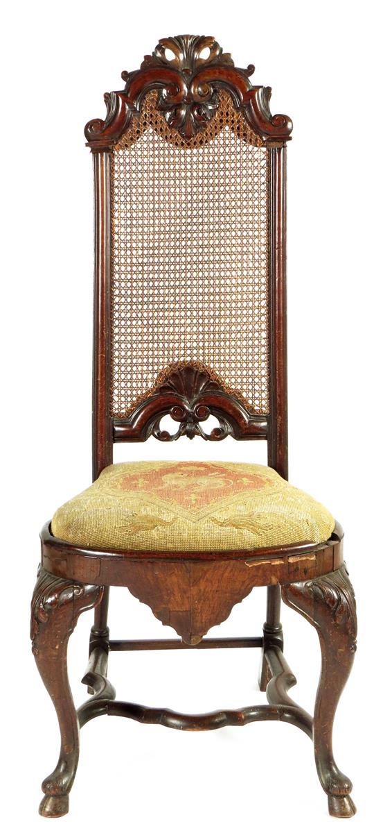 An early 18th century walnut side highback chair, the scroll and leaf carved crest above a cane back and a shell and scroll carved base, with bell shaped needlework drop-in seat, on leaf carved cabriole legs and hoof feet, with a flattened stretcher, possibly Irish.