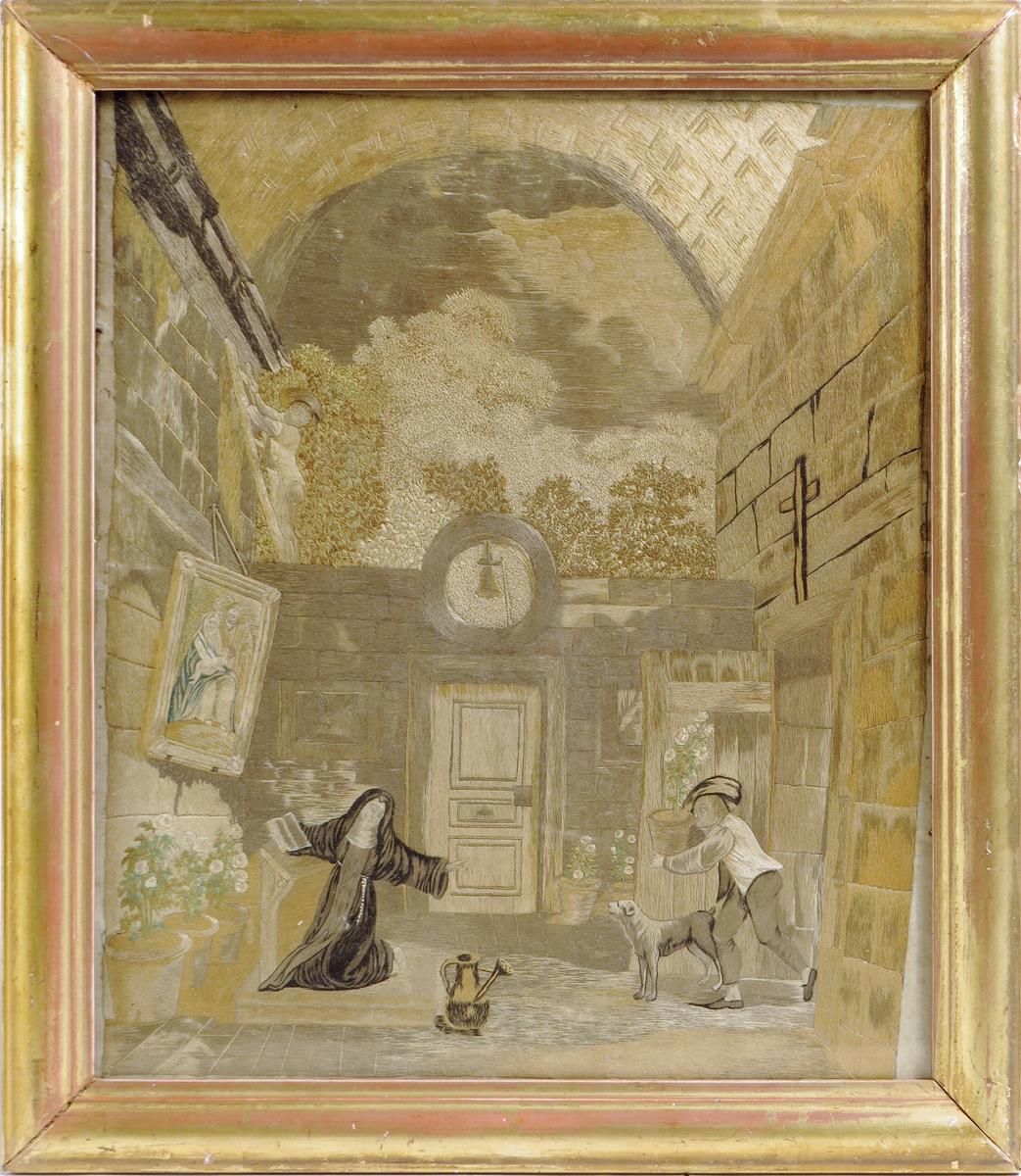 Two 18th century Italian needlework silkwork pictures, one depicting a nun praying interrupted by a man carrying flowers with his dog, the other depicting a Bishop and two assistants holding the Turin shroud, 29.7 x 24.7cm (max). (2)