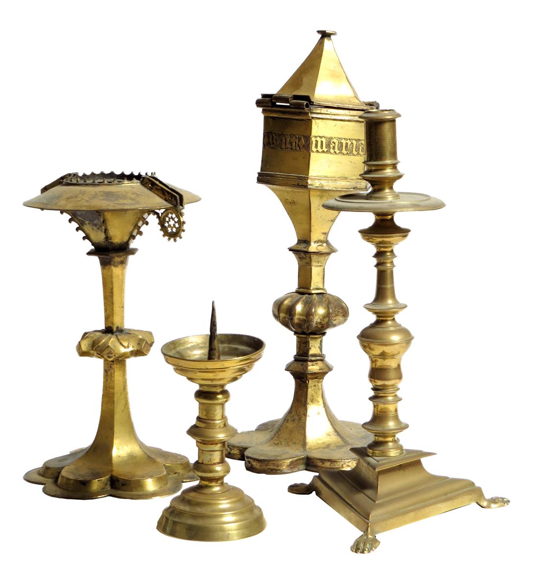 A Gothic gilt copper reliquary, the hexagonal hinged top with a band of script on a lobed stem and petal foot, possibly 15th century German or Italian, together with a similar gilt copper reliquary base and two brass candlesticks, 32.8cm high (max). (4)