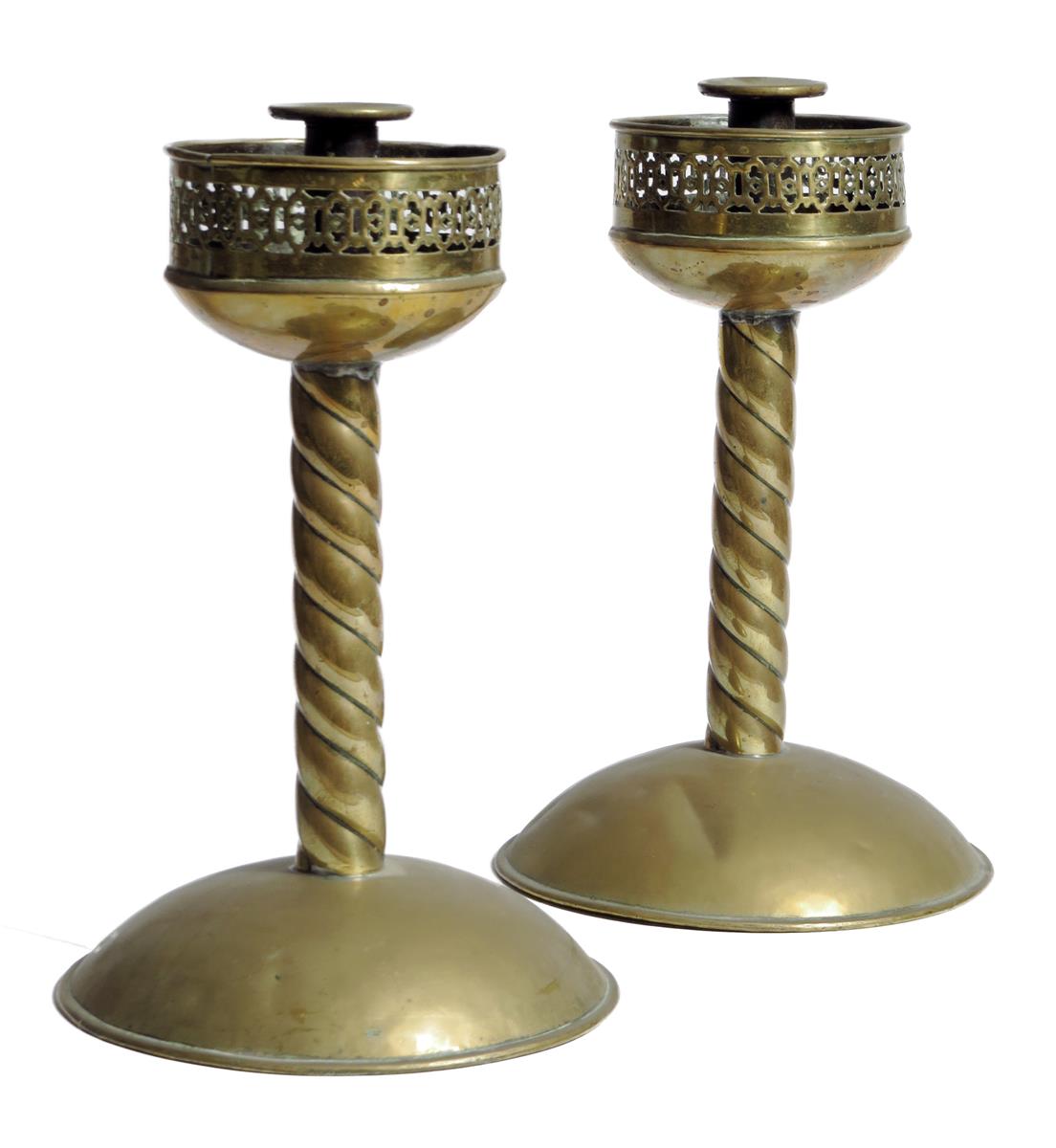 A pair of brass candlesticks, each with a detachable nozzle and a pierced Gothic style galleries, on a spiral twist stem and a domed foot, 30.7cm high. (2)