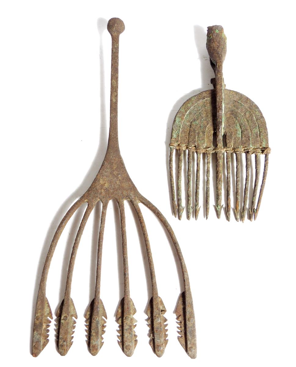 Two wrought iron eel spears, 18th / 19th century, 43cm high (max). (2)