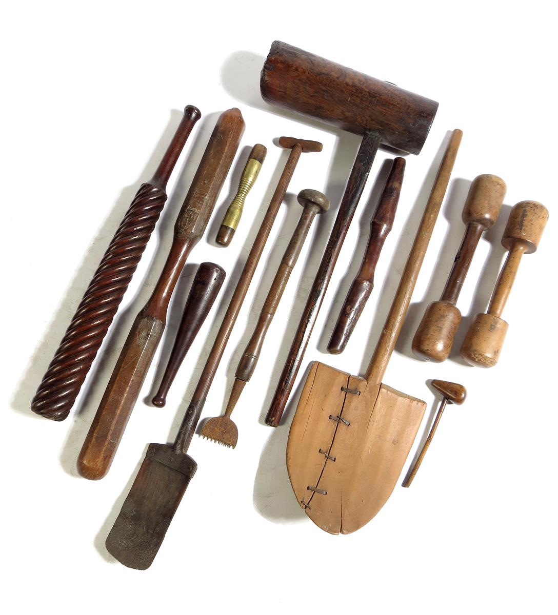 Treen. A collection of carved and turned tools, including: a mallet, dumbbells, a scraper, a spade, a baker's shovel, two clubs, one with a spiral twist stem, the other inscribed 'MACXS, COMET' with an inscribed paper label, in various woods including lignum vitae and hardwoods, 116.3cm long (max). (12)