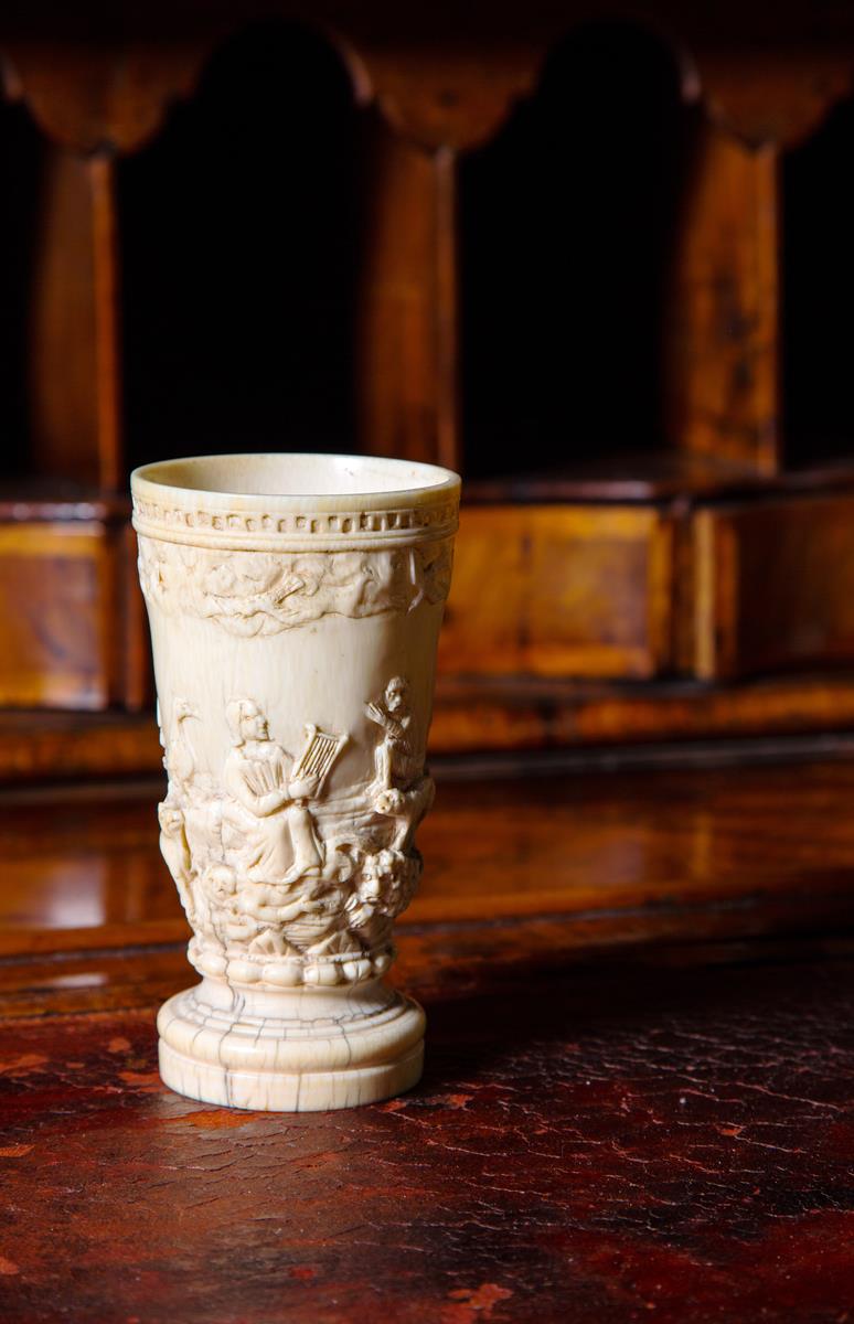λ A carved ivory goblet, of tapering cylindrical form, with a moulded rim above birds flying in the clouds, above Christ as Orpheus seated on a man playing his lyre taming wild beasts including: a lion and a camel and other birds and animals, above a gadrooned base and a moulded foot, 12.4cm high.