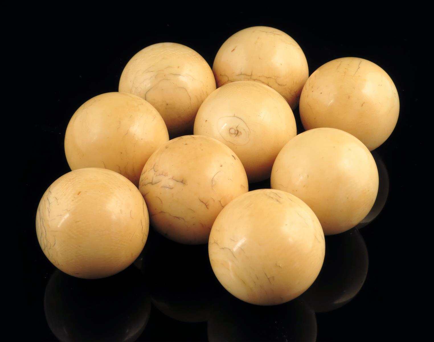 λ Nine ivory billiard balls, one with traces of red paint, late 19th / early 20th century, 5cm diameter. (9)