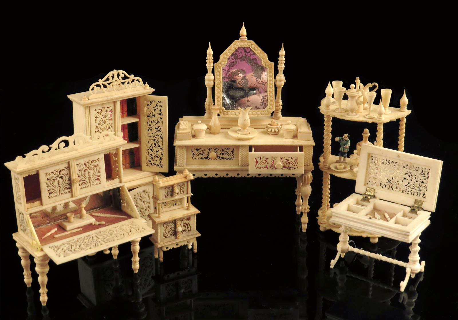 A collection of 19th century bone doll's house furniture, with pierced fret carved and turned decoration, comprising: a dressing table with a swing mirror, the drawers containing a comb and other items, a bureau, the interior with a quill, seal and other items, an etagere with plates, pots, goblets and Chinese style figures, a work table, a bookcase the interior with books and a small cabinet, 12.6cm high (max). (6)