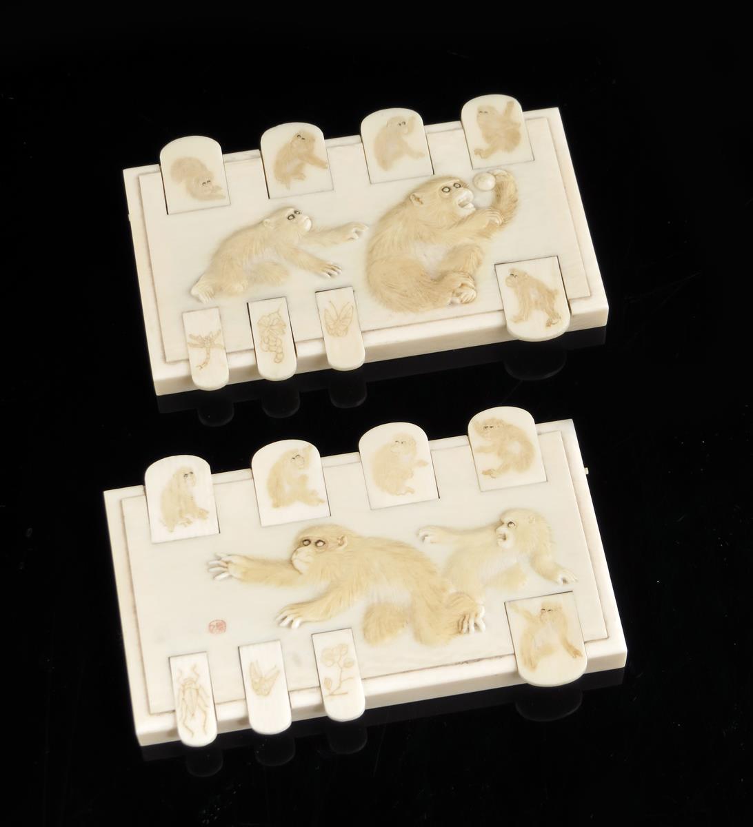 λ A pair of Japanese ivory whist markers, each carved with monkeys, and engraved with insects and flowers, signed, Meiji 1868-1912, 9cm wide. (2)