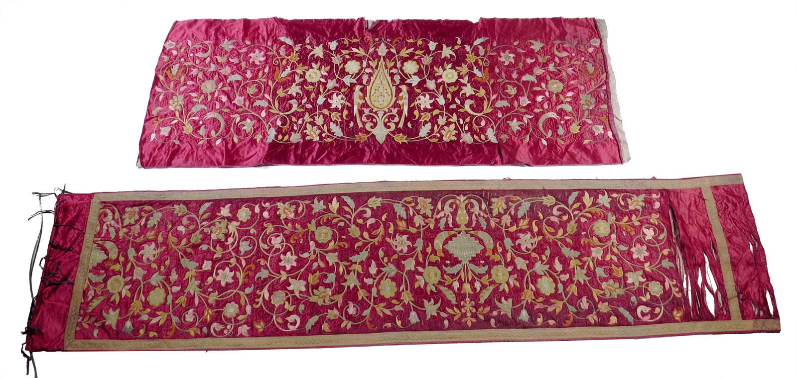 Four Ottoman or Persian silk and metal thread embroidered needlework panels, worked with coloured silks and gilt and silver thread, decorated with scrolling leaves and flowers with birds and urns, on a rich ruby red ground, two with cartouches inscribed with script, possibly table runners, late 18th / early 19th century, 69 x 485cm (max). (4)