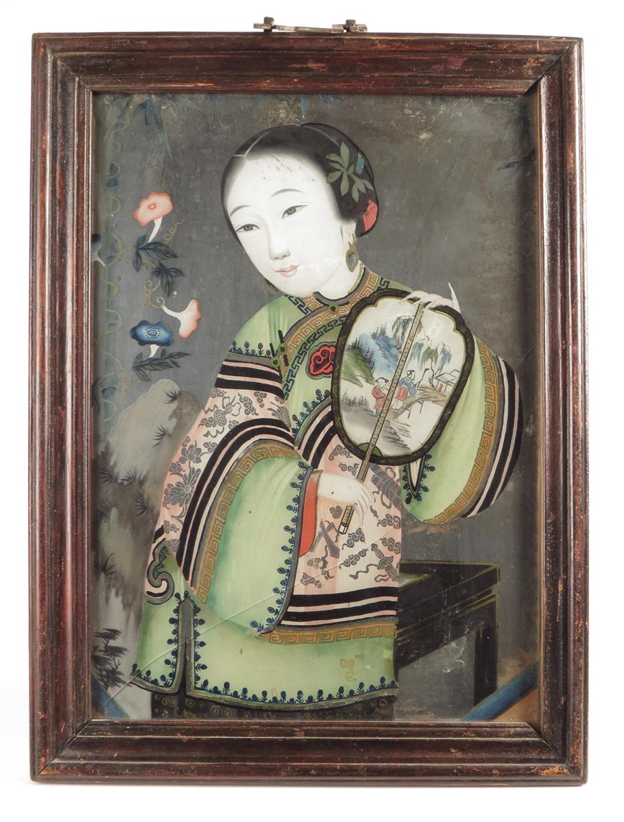 Four Chinese reverse glass portrait paintings of ladies, two behind mirrors, 19th / 20th century, 48.8 x 33.5cm (max), all framed. (4)
