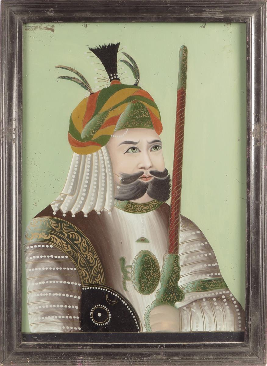 A pair of Chinese reverse glass portrait paintings, one possibly of Genghis Khan, the other of an Indian Prince, together with three reverse glass paintings of Indian gods including: Saraswati, 59.5 x 44cm (max), all framed. (5)