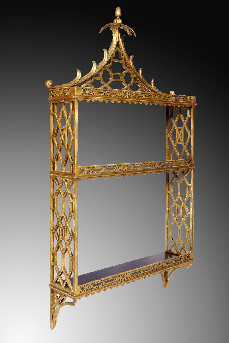 A set of 'Chinese Chippendale' giltwood and mahogany hanging wall shelves, with a carved leaf and fretwork surmount with an acorn finial above three tiers with pierced fretwork galleries and ends, inscribed '4305A', possibly 18th century, 142cm high, 79.3cm wide, 18.5cm deep.