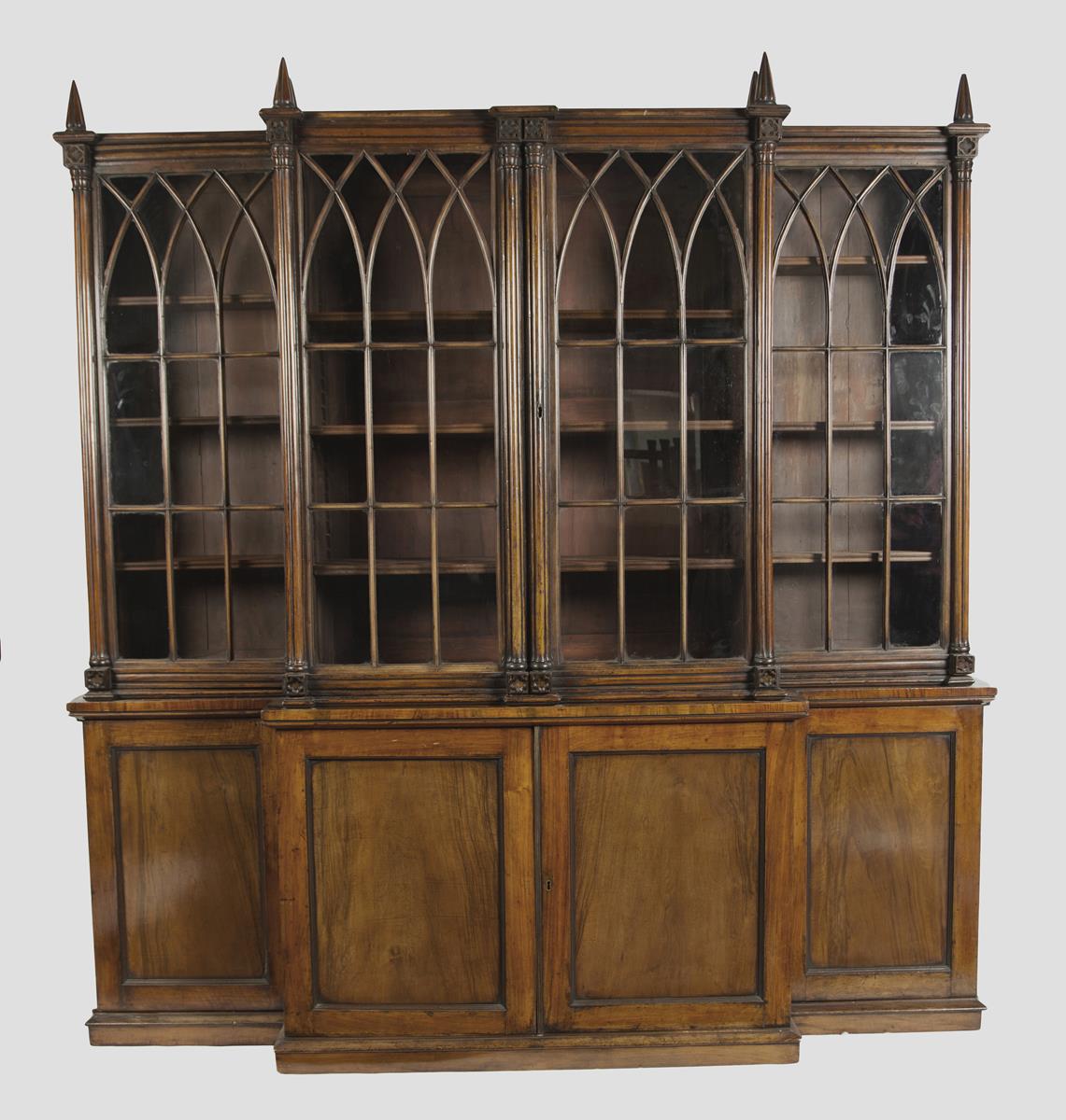A walnut Gothic breakfront bookcase, the detachable top with lobed spire finials above four lancet astragal glazed doors, flanked by cluster columns and quatrefoil blocks, each enclosing adjustable shelves, the base with panelled doors enclosing shelves, early 19th century with later adaptions, 215.8cm high, 204cm wide, 44.5cm deep.