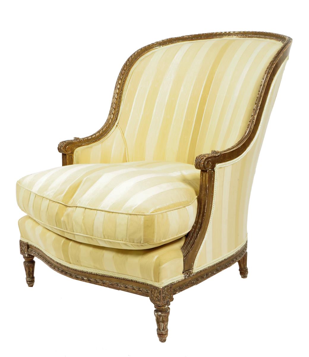A carved giltwood bergere in Louis XVI style, the moulded frame decorated with a ribbon border, leaves and paterae with yellow striped watered silk upholstery, late 19th century.