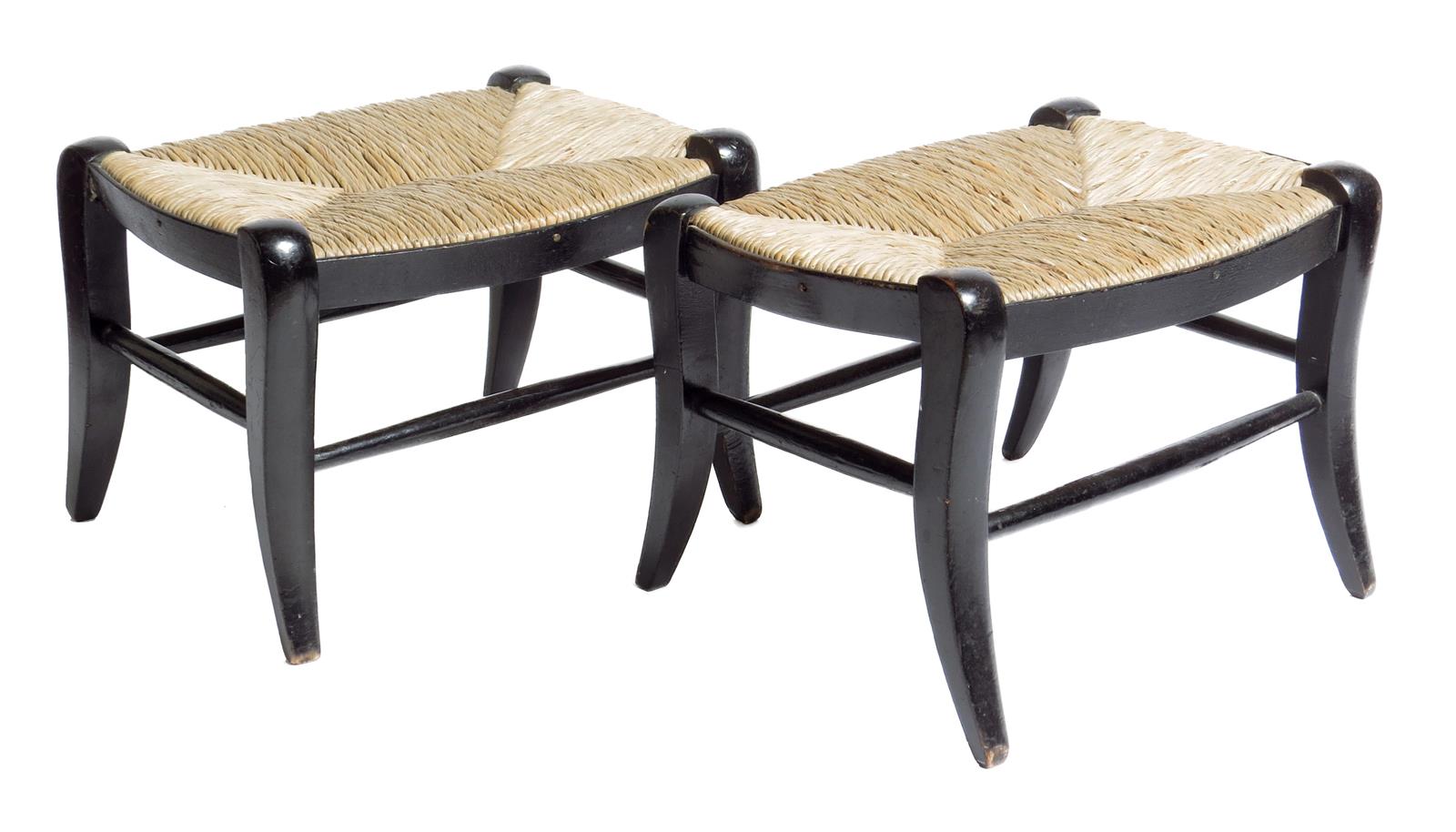 A pair of ebonised stools, each with a rush seat on sabre legs, 21cm high, 28.6cm wide, 21.5cm deep. (2)