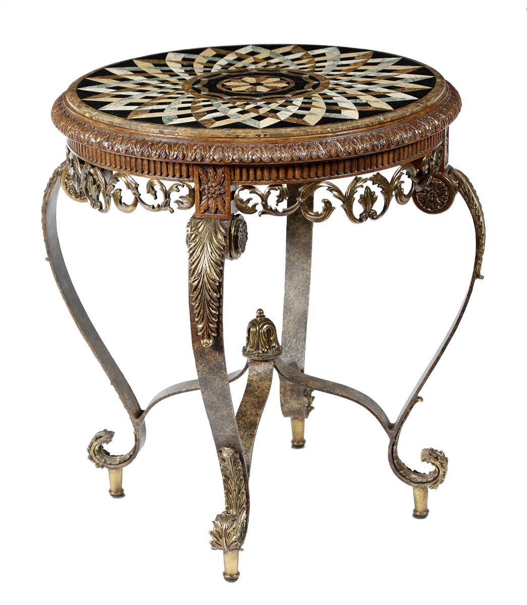 A marble and metal occasional table, the circular top inlaid with eliptical designs, on cabriole legs with gilt metal mounts, 70.2cm high, 68.5cm wide.
