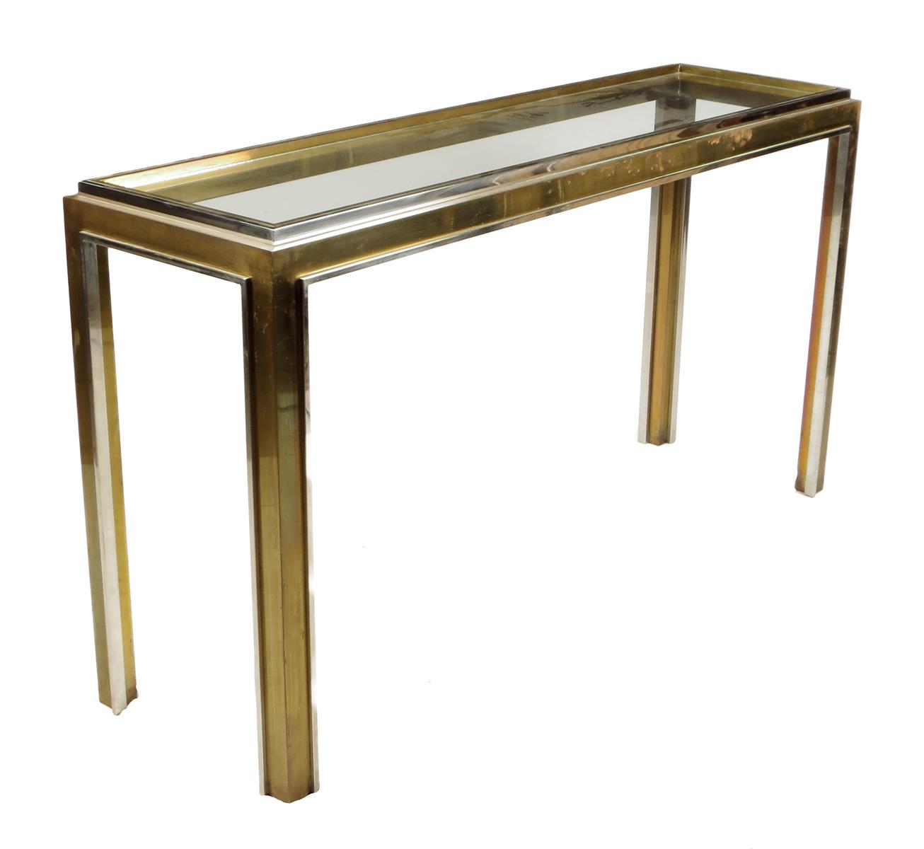A modern brass and silvered metal console table, with an inset glass top, 77.7cm high, 141.4cm wide, 42.3cm deep.