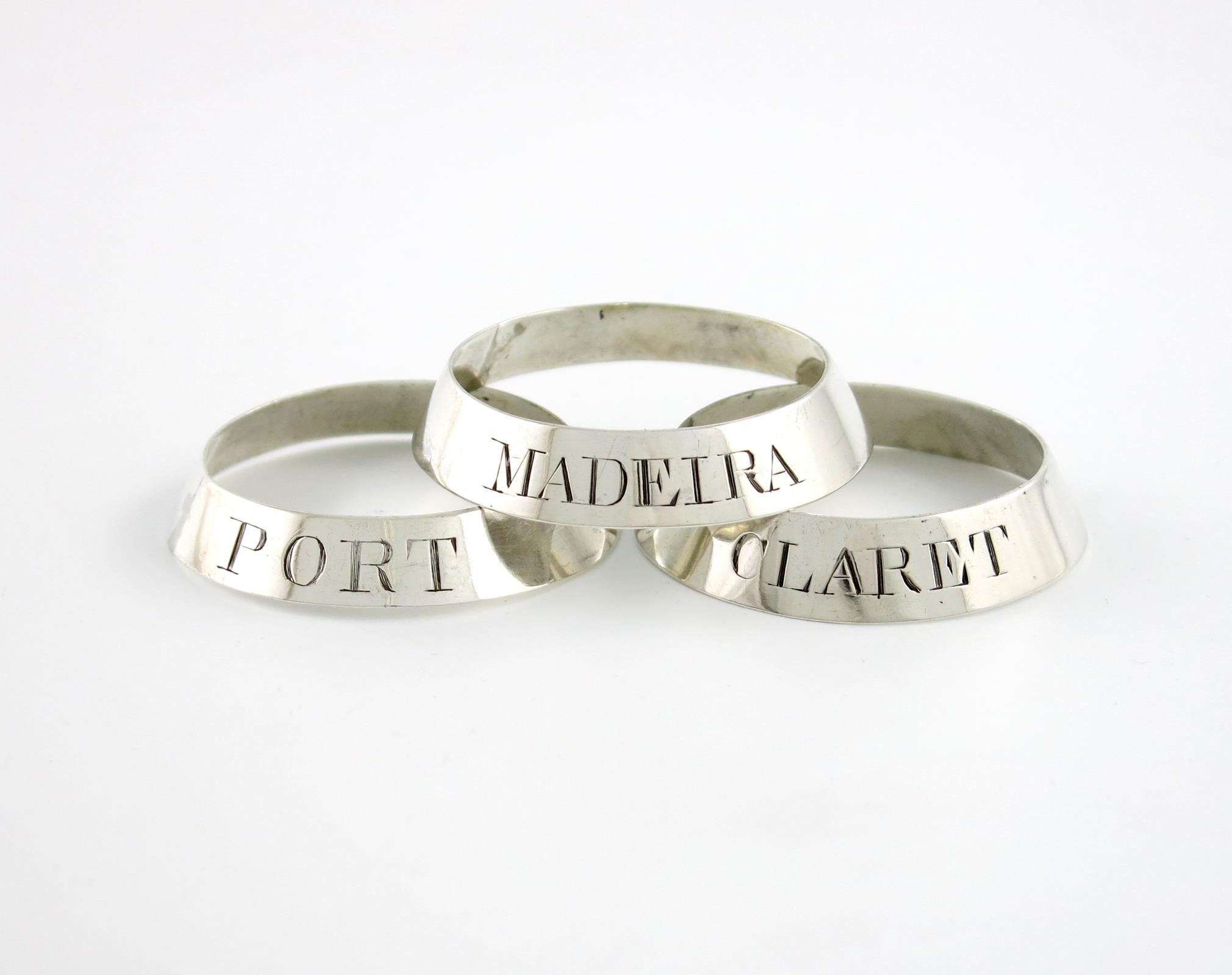 tapering form, incised 'CLARET', 'MADEIRA' and 'PORT', approx. weight 1.5oz. (3)