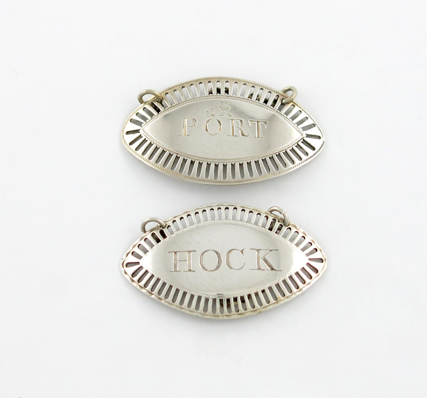 oval eye form, pierced with slats, engraved with a crest and incised 'PORT', plus another similar label, by Susanna Barker, incised 'HOCK', length 5cm, approx. weight 0.6oz. (2)