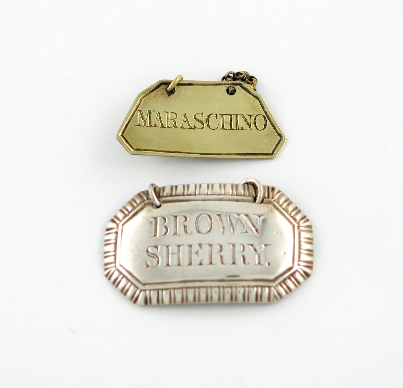 rectangular form, canted corners, gadroon border, incised 'BROWN SHERRY', length 4.2cm, plus a Victorian silver-gilt wine label, by the same maker, London 1849, incised 'MARASCHINO', approx. weight 0.5oz. (2)