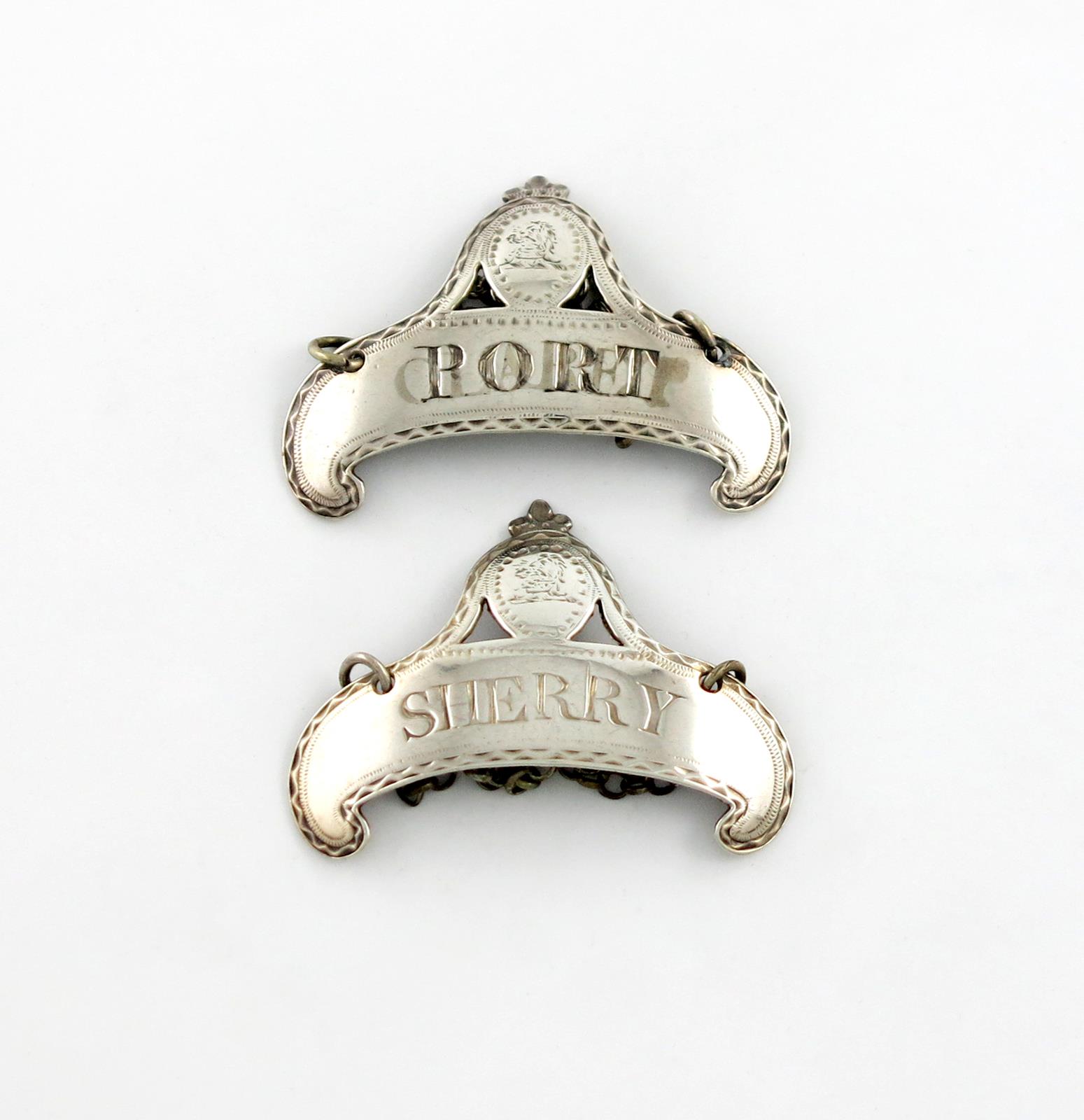 scroll form, with a raised and pierced pediment, crested, bright-cut borders, incised 'SHERRY' and one re-titled 'PORT', length 4.8cm, approx. weight 0.6oz. (2)