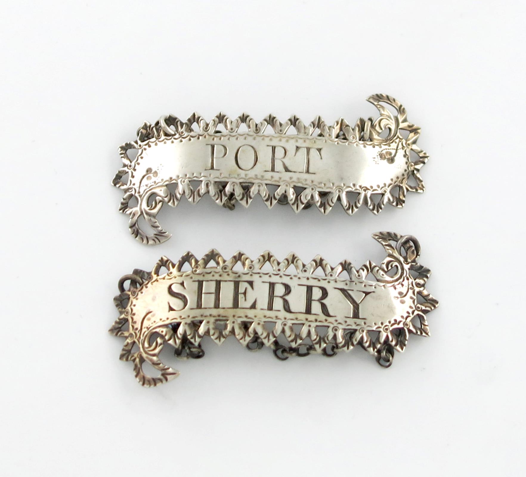 scroll banner form, pierced borders, engraved decoration, incised 'PORT' and 'SHERRY', length 6.2cm, approx. weight 0.5oz.