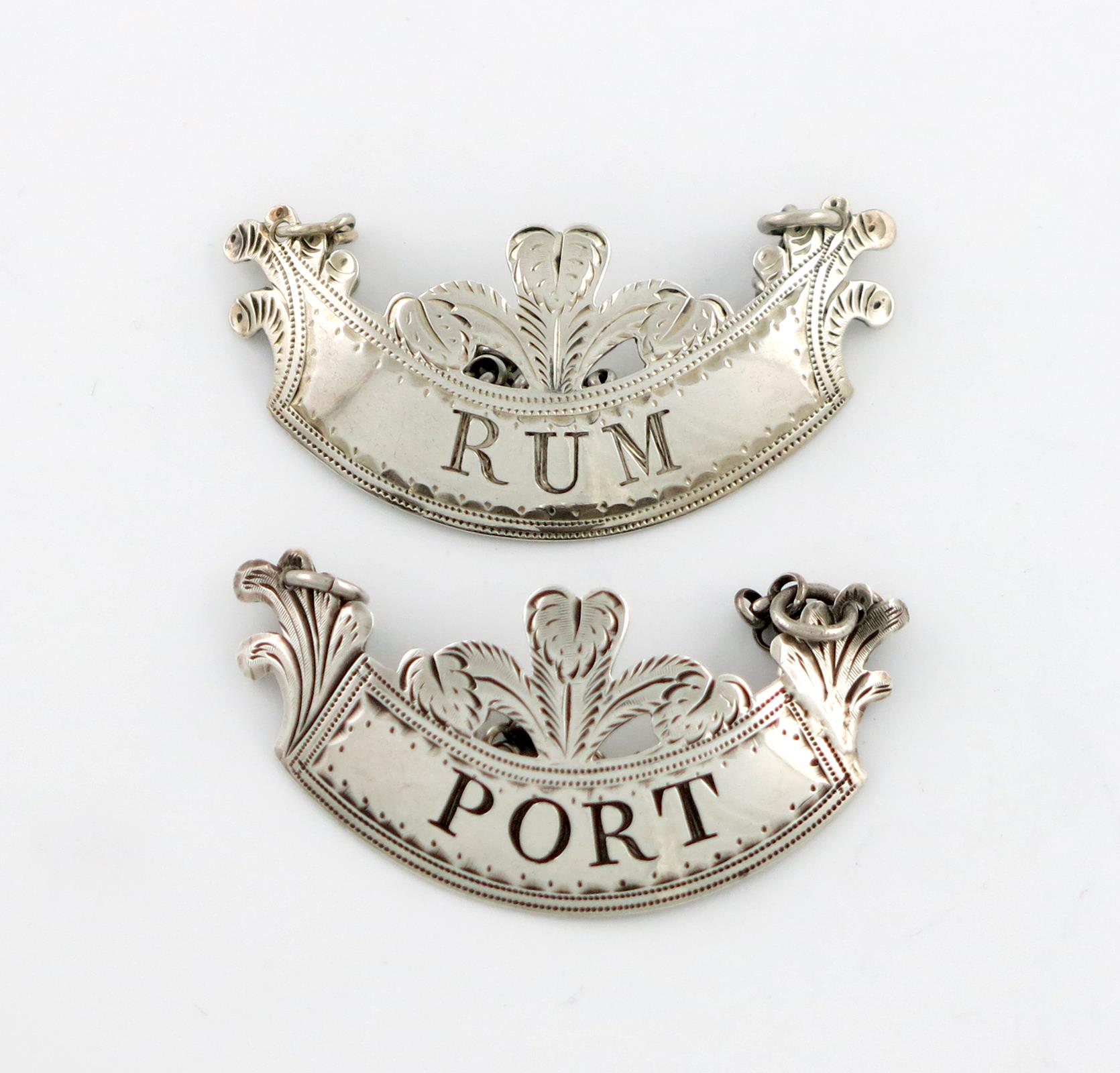 banner form, mounted with Prince of Wales's Feathers, and with foliate ends, bright-cut borders, incised 'RUM' and 'PORT', length 5cm, approx. weight 0.5oz. (2)