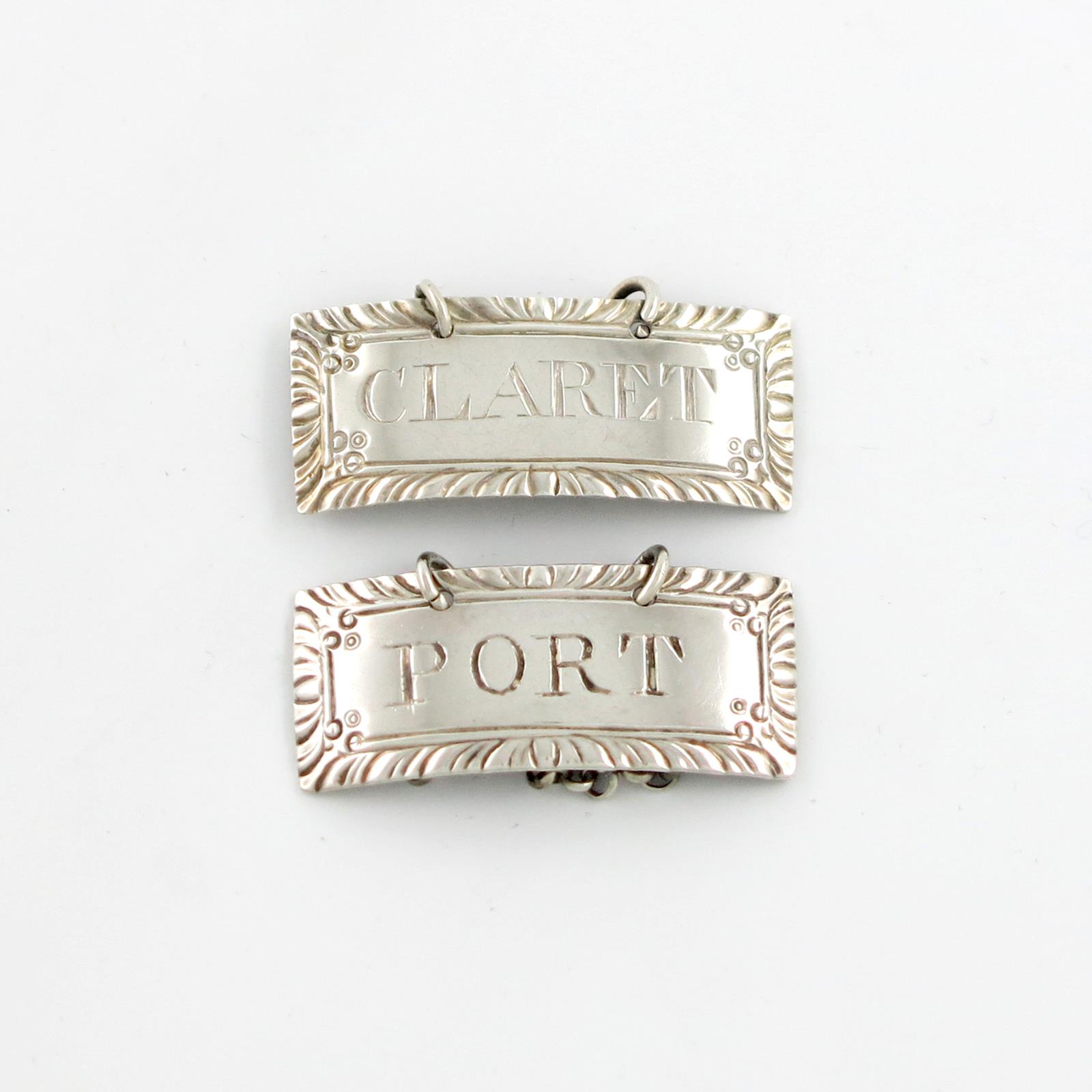 rectangular form, Feather-edge border, incised 'CLARET' and 'PORT', length 4.3cm, approx. weight 0.5oz. (2)