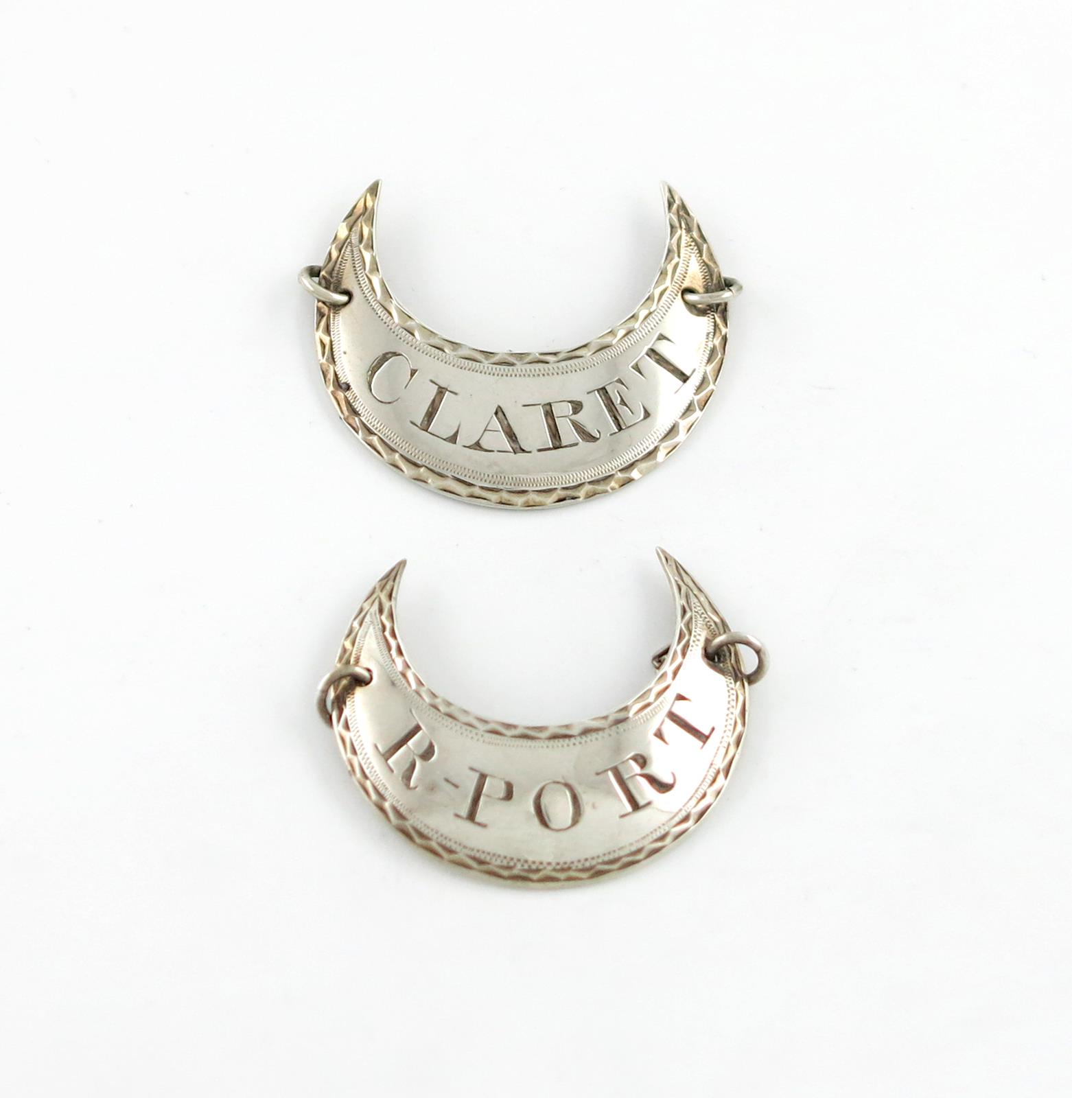 crescent form, bright-cut border, incised 'R.PORT', and 'CLARET', length 3.8cm, approx. weight 0.4oz. (2)