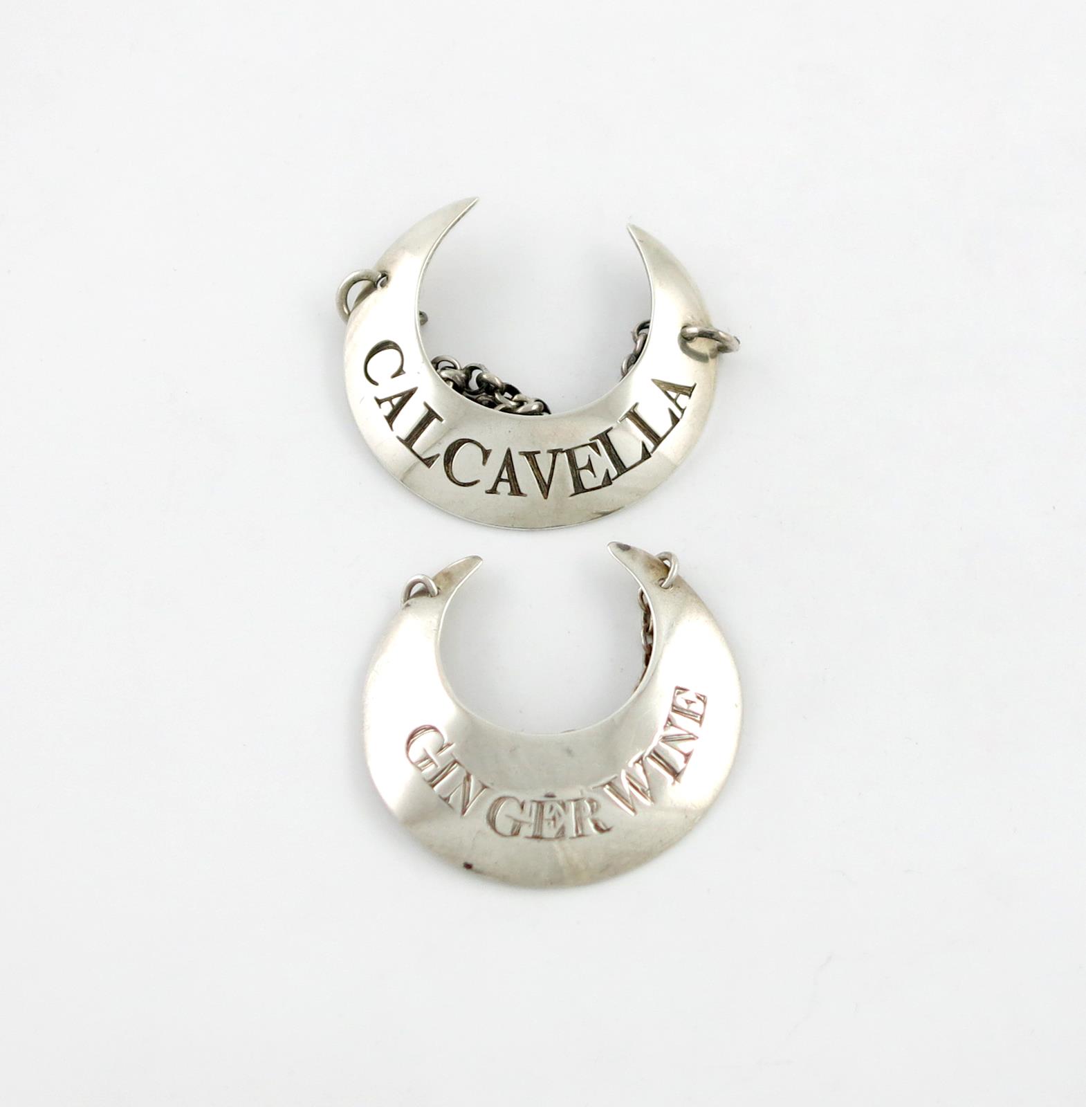 crescent form, incised 'GINGER WINE', and another George III silver wine label, by Peter and Ann Bateman, London 1794, crescent form, incised 'CALCAVELLA', approx. weight 0.4oz. (2)