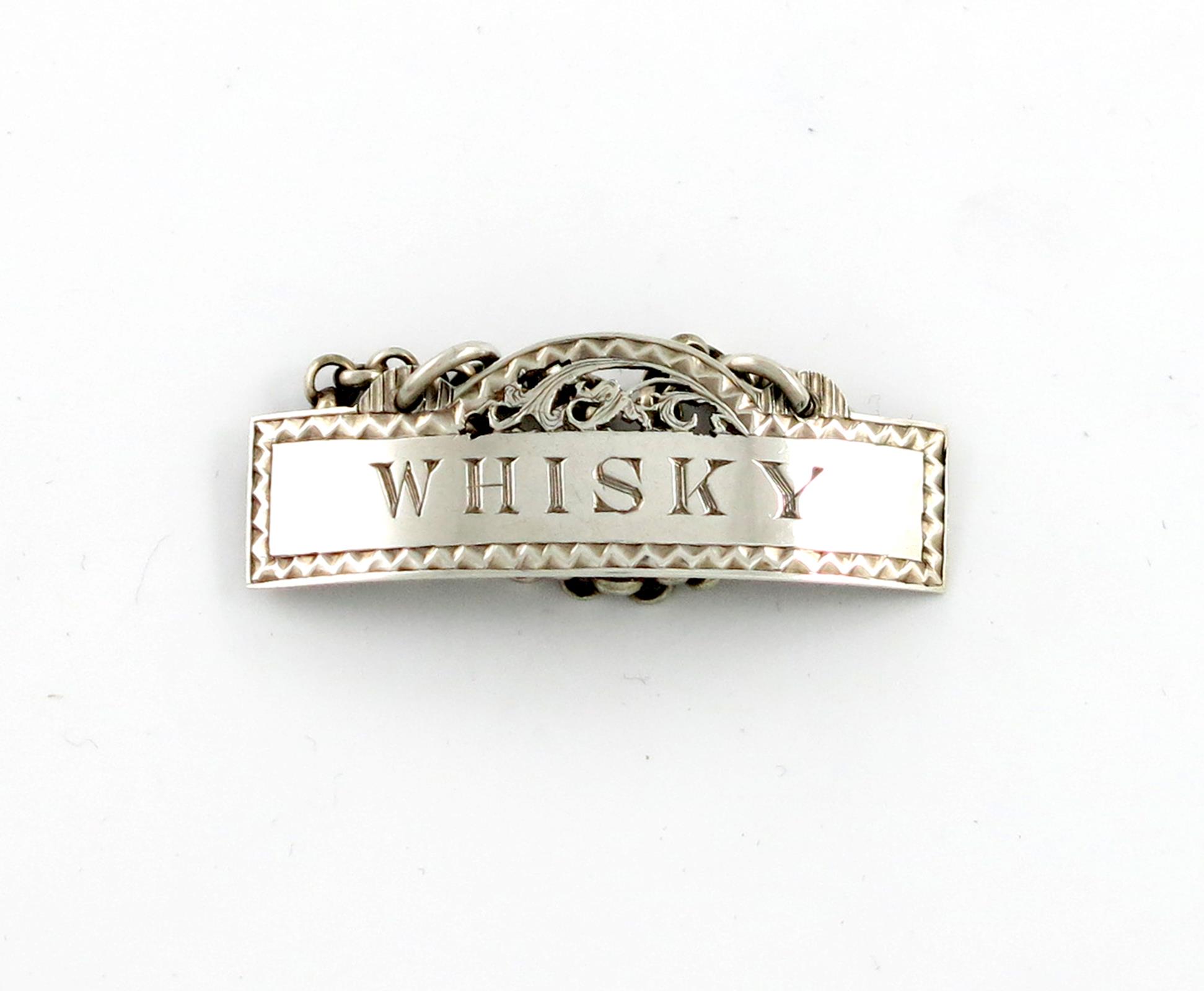 arched rectangular form, pierced pediment, bright-cut borders, incised 'WHISKY', length 4.5cm, approx. weight 0.3oz.